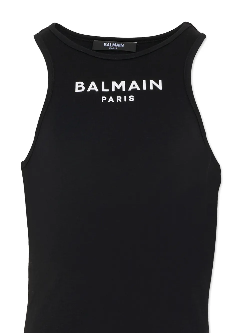 New Season Balmain Kids logo-detail sleeveless dress Imported Highlights black round neck sleeveless straight hem Composition Organic Cotton 94%, Elastane 6% Washing instructions Read Manufacturer Guidelines Product IDs FARFETCH ID: 33699874 Brand style ID: BY1A12Z3277930BC
