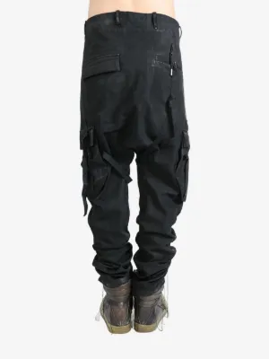 Boris Bidjan Saberi cargo trousers Made in Italy Highlights black cotton coated finish front button and zip fastening belt loops two side cargo pockets strap detailing low-rise rear flap pocket rear button-fastening pocket Composition Cotton 98%, Elastane 2% Washing instructions Read Manufacturer Guidelines Product IDs FARFETCH ID: 25774346 Brand style ID: P36FDD10006