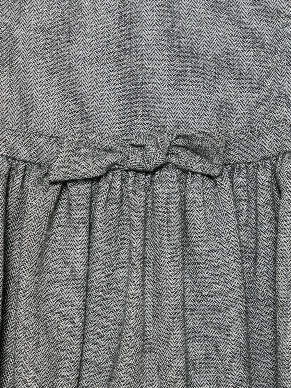 Il Gufo bow herringbone dress Imported Highlights charcoal herringbone pattern short sleeves bow detail gathered skirt rear zip fastening Composition Lining: Acetate 58%, Viscose 42% Outer: Wool 54%, Viscose 27%, Polyamide 17%, Polyester 2% Washing instructions Dry Clean Only Product IDs FARFETCH ID: 32328298 Brand style ID: A25GVM0002W0065
