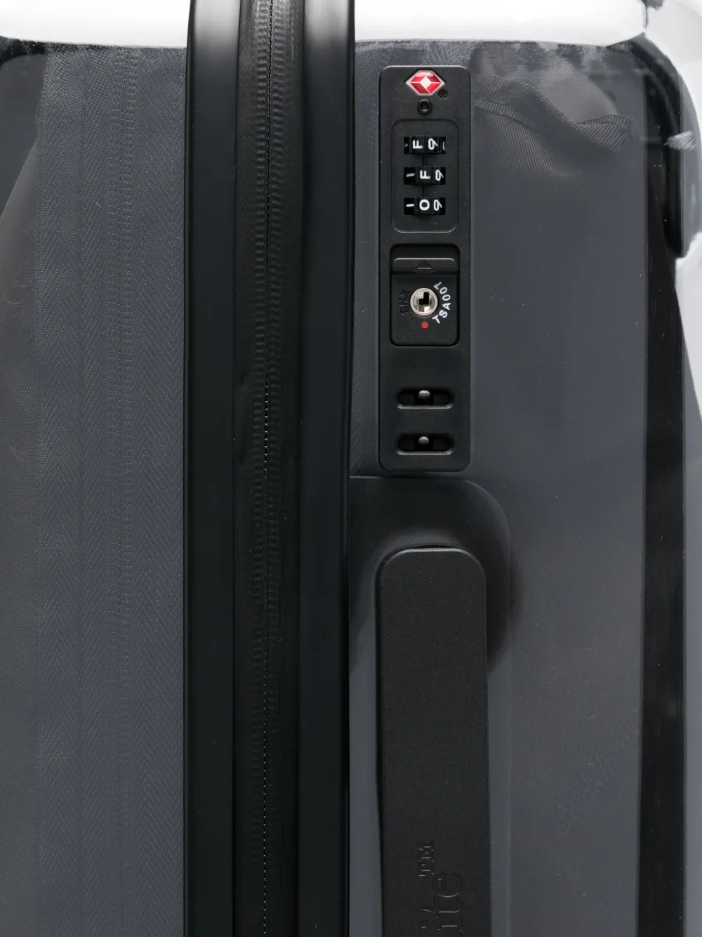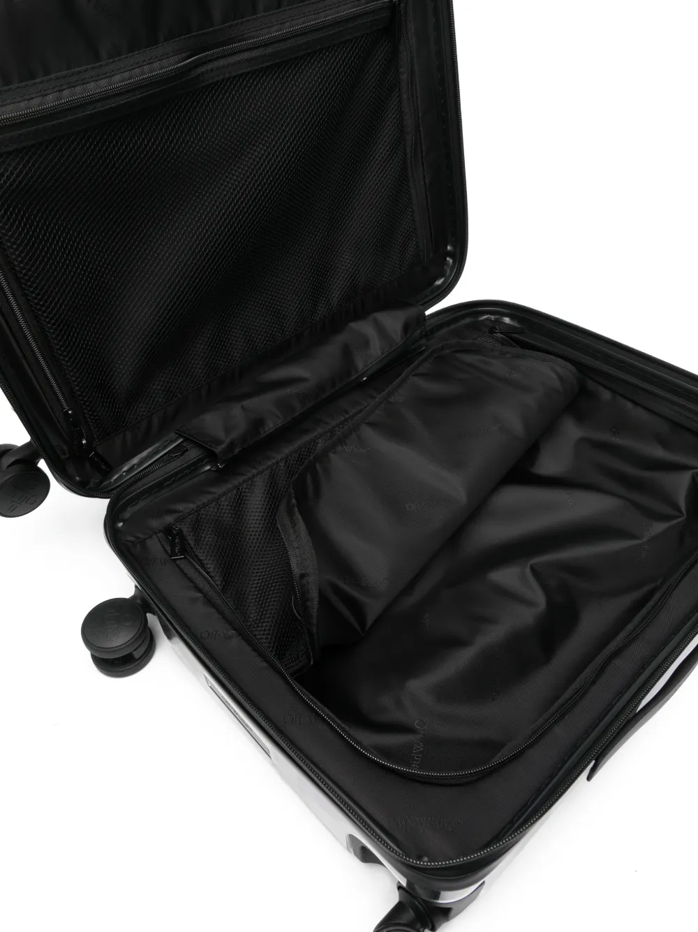New Season Off-White arrows trolley luggage Imported Highlights white transparent case black fabric inserts and hardware arrows motif top handle four wheels zip fastening combination padlock comes with a sticker pack This piece comes complete with a protective dust bag. Composition Outer: Polycarbonite 100% Product IDs FARFETCH ID: 33297131 Brand style ID: OWZH001C99PLA0017910