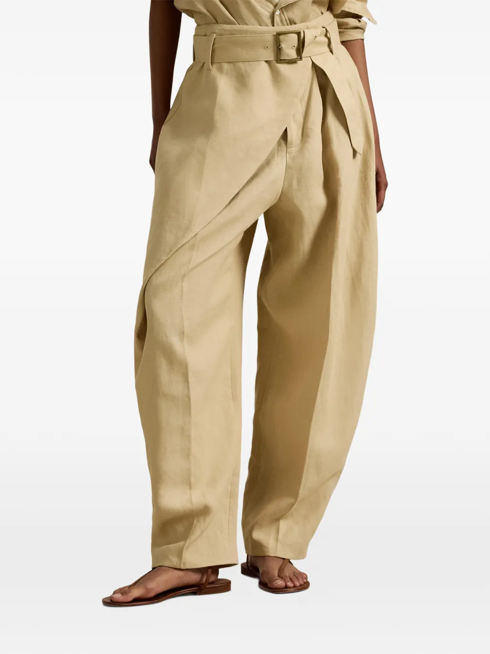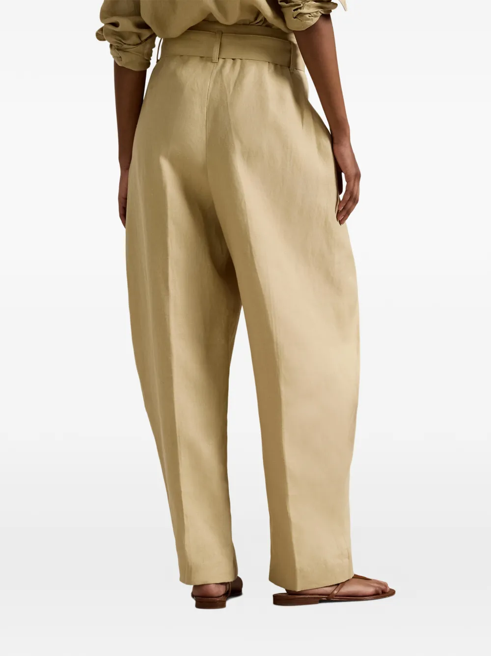 New Season Polo Ralph Lauren tapered wrap trousers Imported Highlights beige belt wrap detail tapered leg pleated detail high-waisted Composition Linen/Flax 100% Washing instructions Read Manufacturer Guidelines Product IDs FARFETCH ID: 32631951 Brand style ID: 211A96322