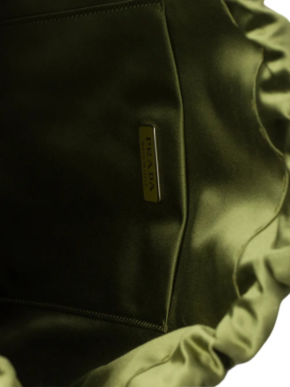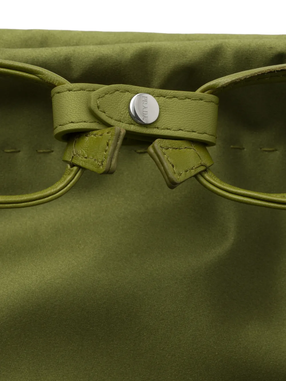 Runway Prada Wish silk duchesse pouch Highlights green drawstring closure logo detail leather handle loop with snap interior with patch pocket Composition Outer: Silk 100% Product IDs FARFETCH ID: 33409082 Brand style ID: 1NK0632G6B