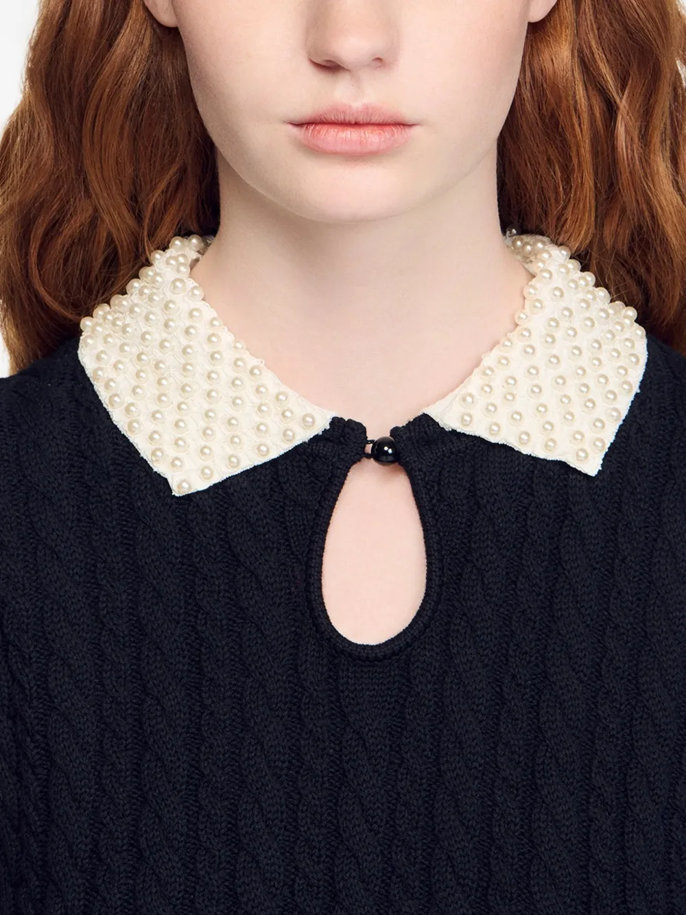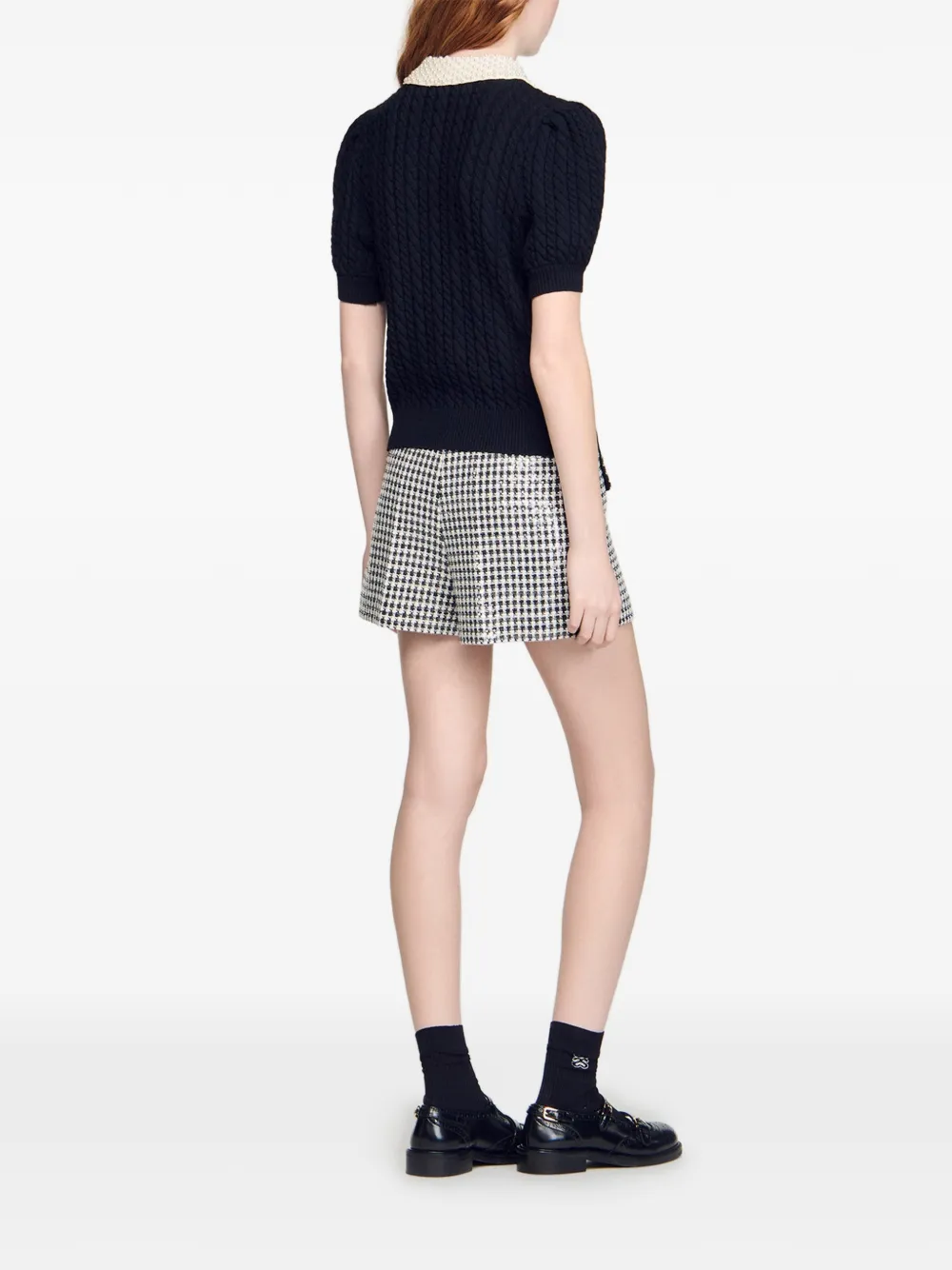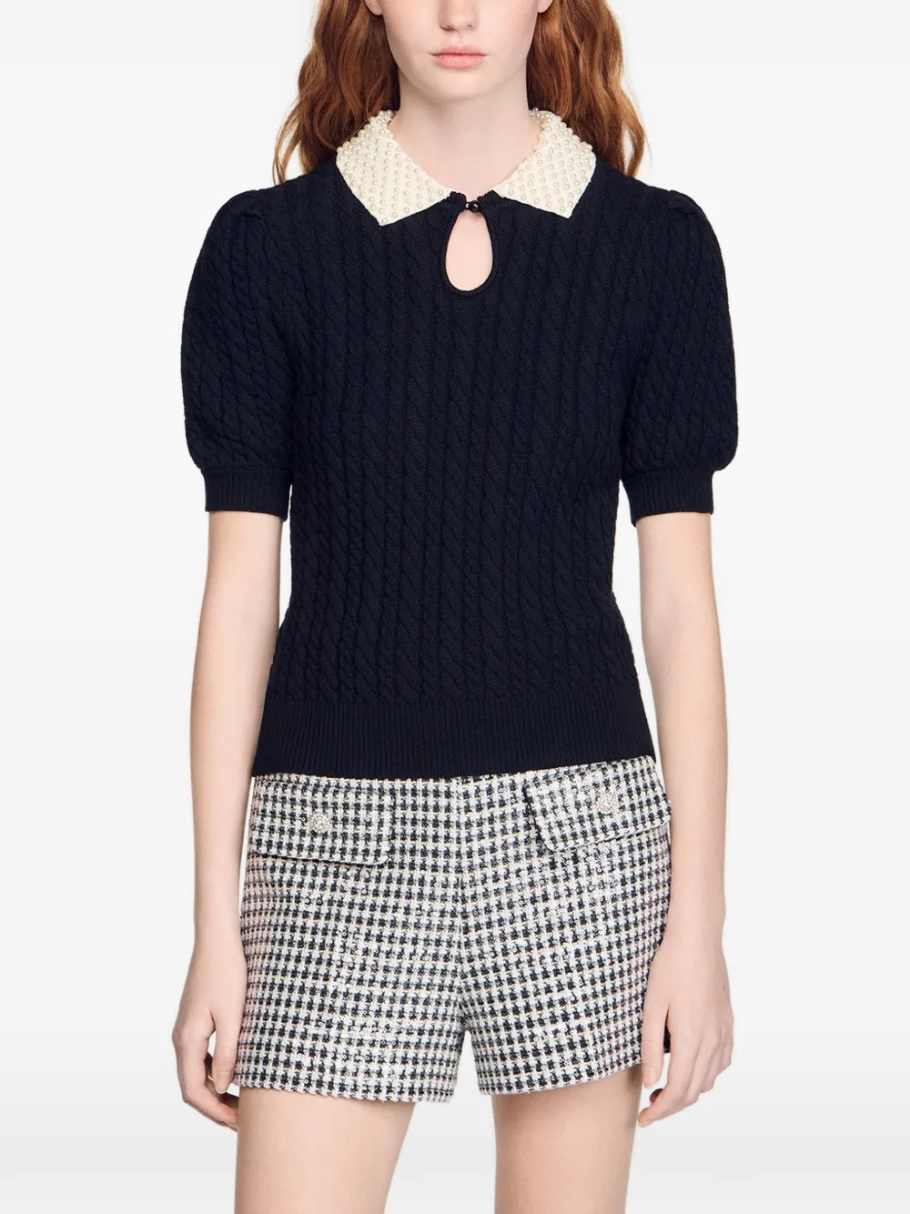 New Season SANDRO collar-detail polo top Imported Highlights black contrasting collar short sleeves keyhole detail Composition Cotton 62%, Wool 29%, Polyamide 8%, Spandex/Elastane 1% Washing instructions Hand Wash Product IDs FARFETCH ID: 32553054 Brand style ID: SFPPU02799
