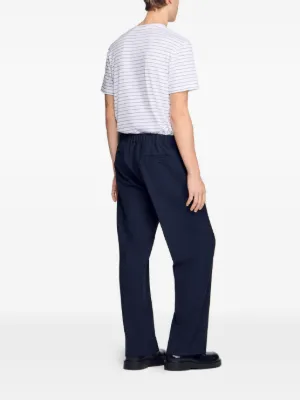 New Season SANDRO elasticated-waist wide-leg trousers Imported Highlights navy blue elasticated waist side pockets wide-leg pleated front Composition Lining: Cotton 100% Outer: Polyester 68%, Viscose 28%, Spandex/Elastane 4% Washing instructions Machine Wash Product IDs FARFETCH ID: 32513874 Brand style ID: SHPPA00893