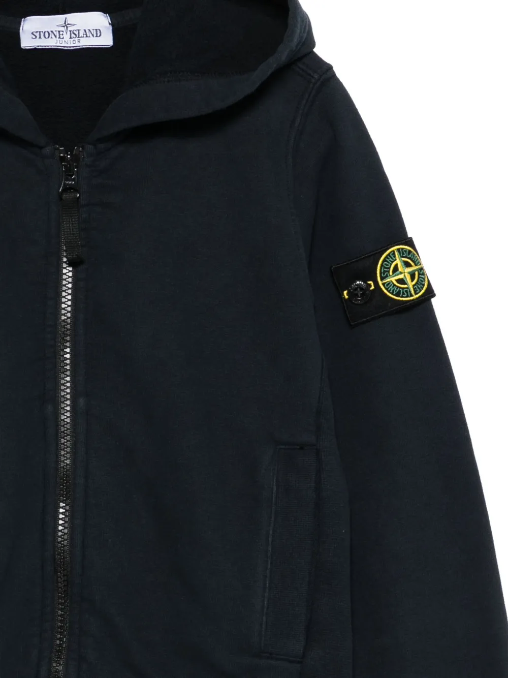 Final Sale Stone Island Junior hooded zip-up sweatshirt Imported Highlights navy blue hooded zip fastening patch detailing front pocket Composition Cotton 100% Washing instructions Read Manufacturer Guidelines Product IDs FARFETCH ID: 32210393 Brand style ID: K2S166100003S0A20